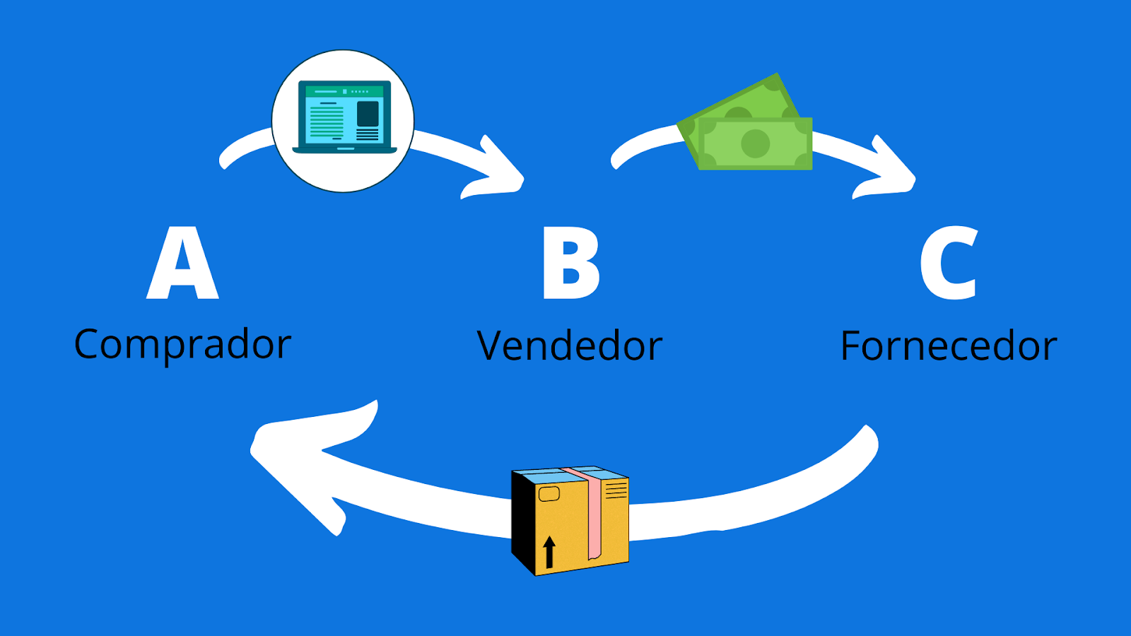 O comprador (A) compra um produto do vendedor (B) através de um website por R$ 49,90. Após a compra ser realizada, o vendedor entra em contato diretamente com o fornecedor (C) e compra este mesmo produto por R$ 29,90. O fornecedor prepara o pedido e envia diretamente ao comprador (A).