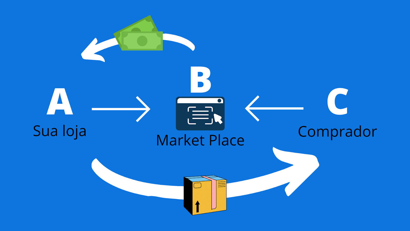 O vendedor (A) coloca seus produtos à venda usando o Market Place (B) como hospedagem, o comprador (C) acha o produto, faz a compra e efetua o pagamento pelo próprio Marketplace, o Marketplace, por sua vez, valida o pagamento e informa a compra para o vendedor, que garante o envio do produto diretamente ao comprador.